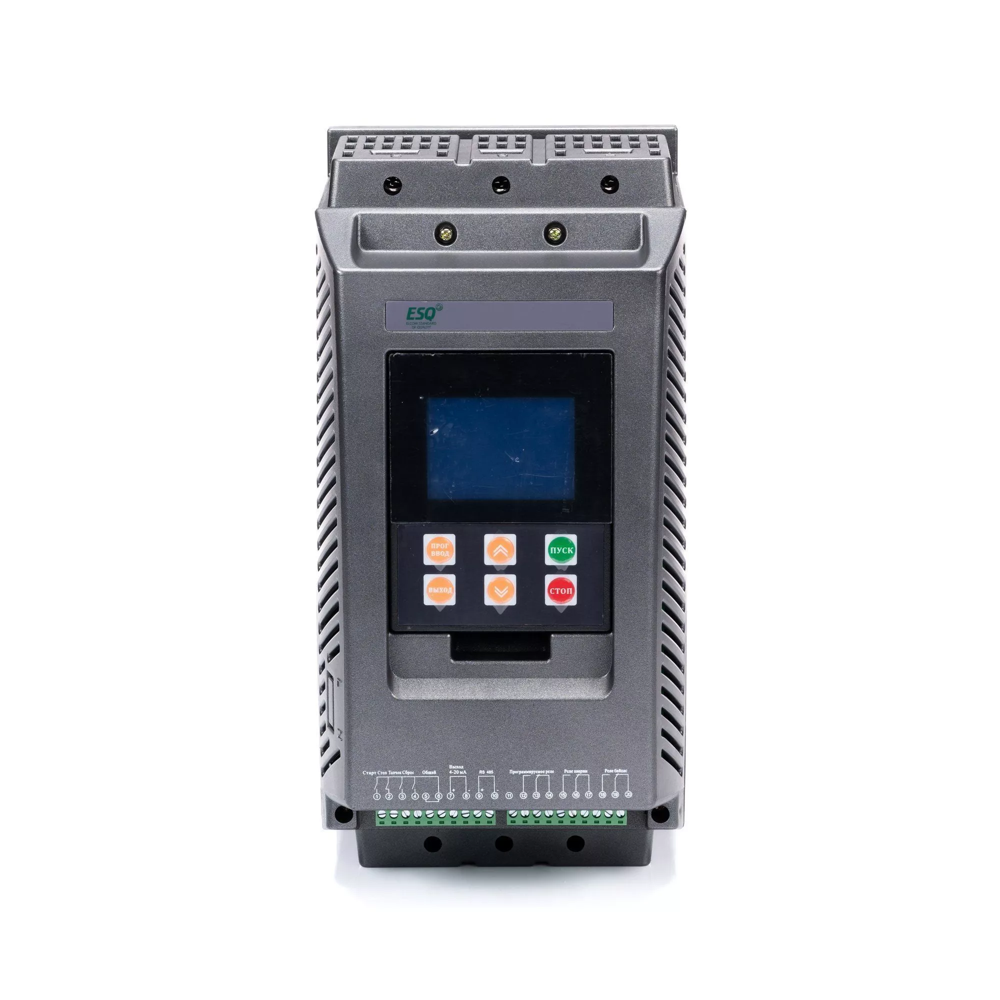 УПП ESQ-GS7:- Использует современные микропроцессорные технологии для обеспечения большей производительности- Выбор одного из 6 режимов работы для обеспечения наилучших условий запуска и останова электродвигателя- Интерфейс с большим ЖК-дисплеем на русском языке (опционально крепежное основание с кабелем 1.5 м)- Встроенный байпасный контактор (до 320 кВт включительно)- Множество функций мониторинга и защиты, дополнительная тепловая защита от перегрузки в соответствии с 6 уровнями настройки нагрузки. Хранение записей о трех последних неисправностях- Поддерживает аналоговый выход 4–20 мА, интерфейс связи RS-485 (используется протокол связи MODBUS RTU), с помощью которого могут производиться управление и мониторинг через главный компьютер для достижения высокого уровня интеграции в системы управления- Реализованы защиты: от потери входной фазы; от потери фазы при работе; от перегрузки по току во время запуска; от перегрузки по току во время работы; от перегрузки во время запуска; от перегрузки во время работы; от перекоса фаз; от перегрева; от пониженного/повышенного напряжения.